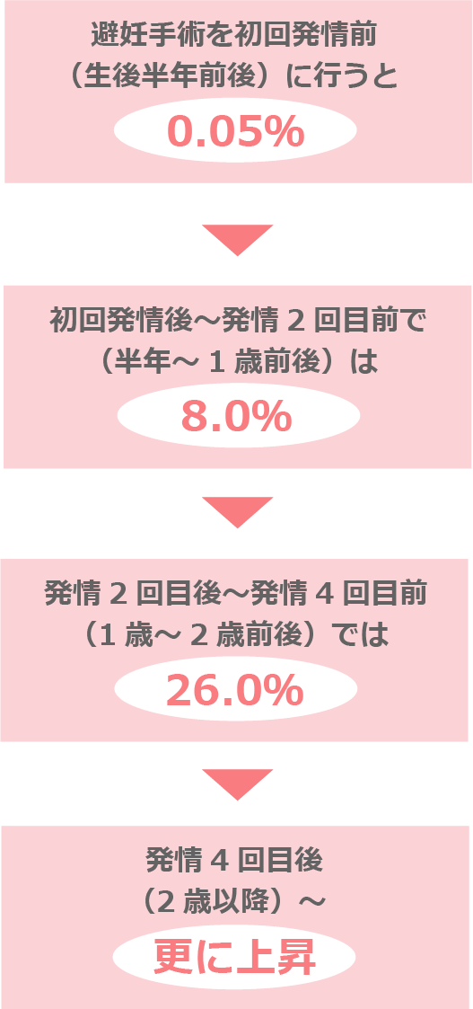| 予防できる病気 | ・卵巣子宮疾患(子宮蓄膿症・子宮内膜炎・子宮捻転・卵巣腫瘍など)・出産に伴う産科疾患・偽妊娠・膣脱・膣過形成・伝染性生殖器腫瘍など |