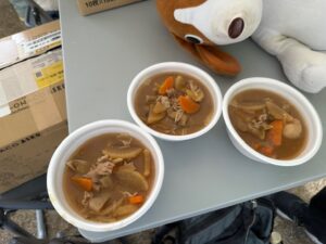 当日は開始直後から雪が舞うくらいの寒さでしたので、いただいた炊き出しの豚汁が温かくておいしくて、心身ともに染み渡りました!