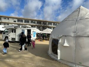 組み立て式避難所が建てられたり、炊き出しやスタンプラリーなどもあって、多くの参加者で賑わっていました。